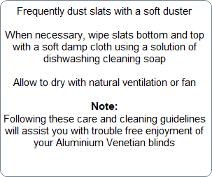 Our Taylor range of aluminium venetian blinds carry a 2 year warranty from date of purchase against faulty workmanship or components.